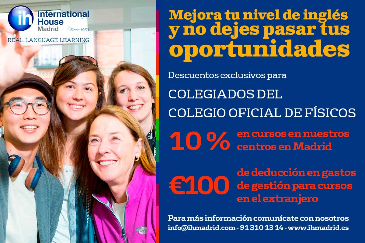 El Colegio Oficial de Físicos ha firmado un acuerdo con International House Madrid por el que los colegiados y sus hijos pueden beneficiarse de precios reducidos en la matrícula de los cursos de inglés, francés y alemán en cualquiera de sus 7 escuelas de idiomas en Madrid así como en los gastos de gestión de los cursos en el extranjero.