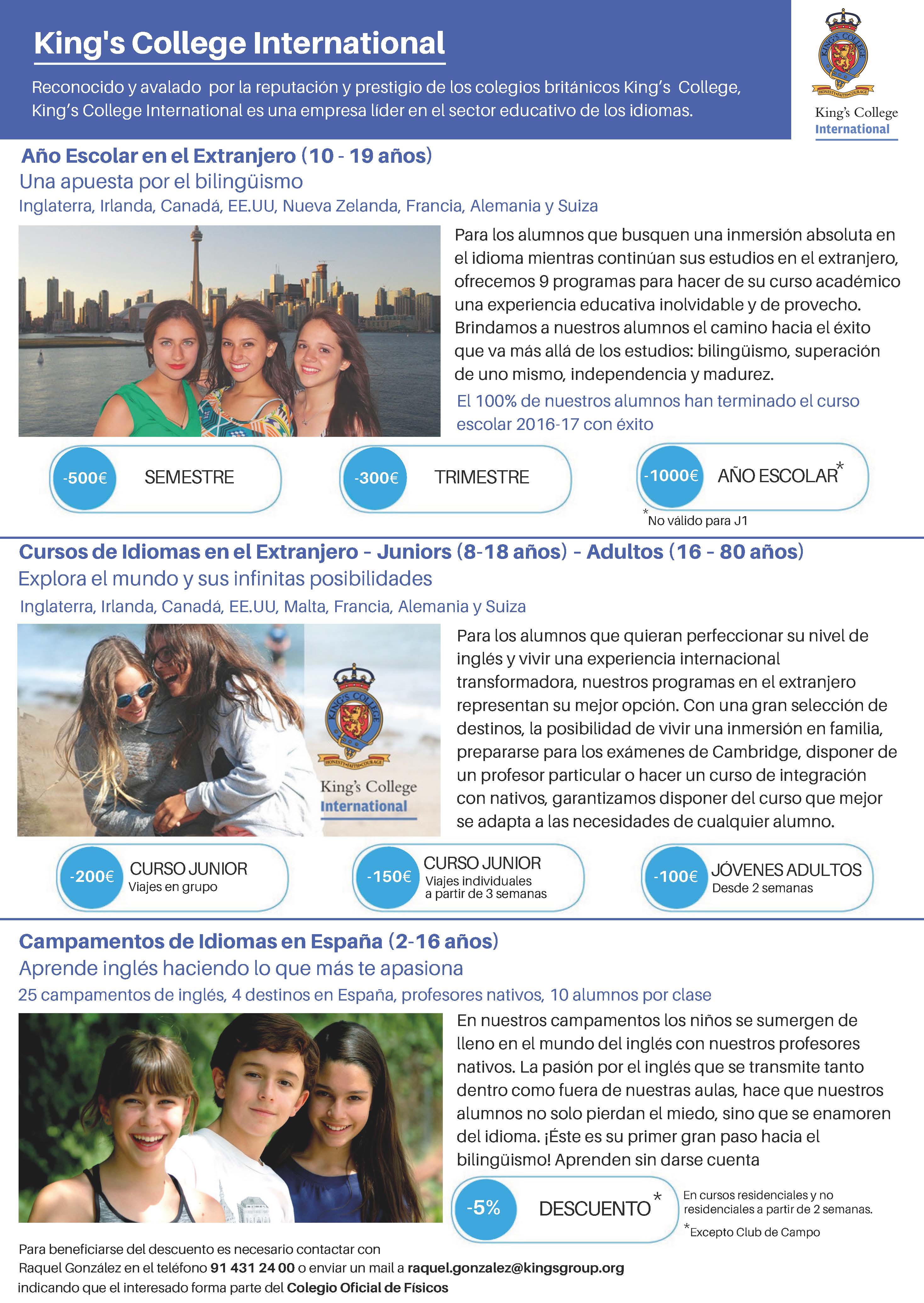 El Colegio Oficial de Físicos ha firmado un acuerdo con King's College International por el que los colegiados y sus hijos pueden beneficiarse de precios reducidos en la matrícula de los cursos de inglés en España y en el extranjero.